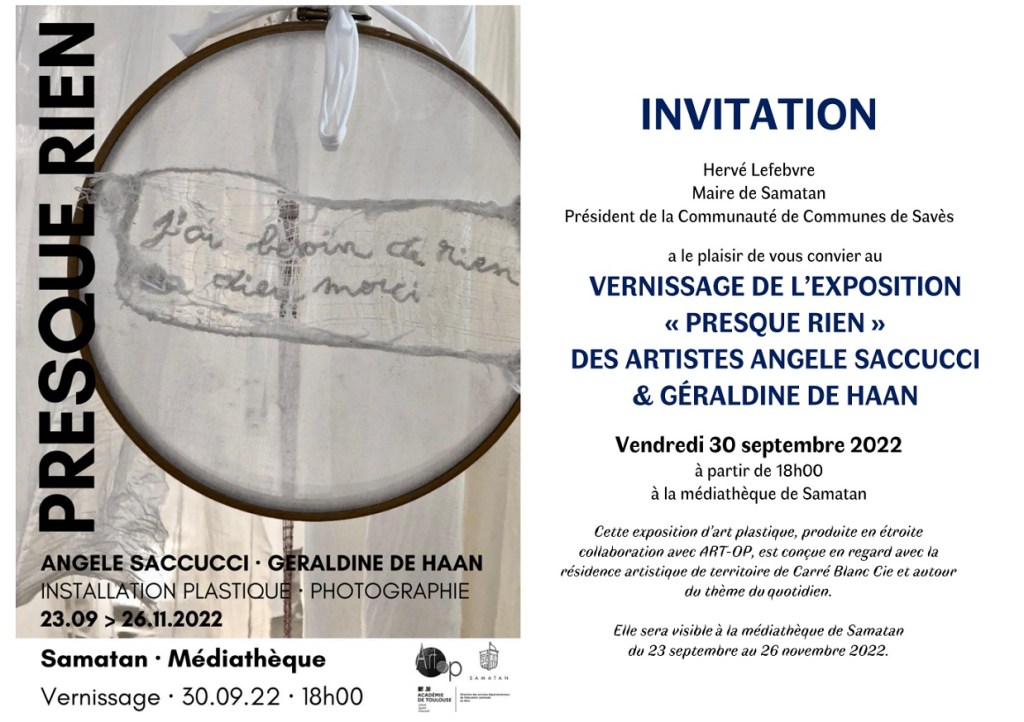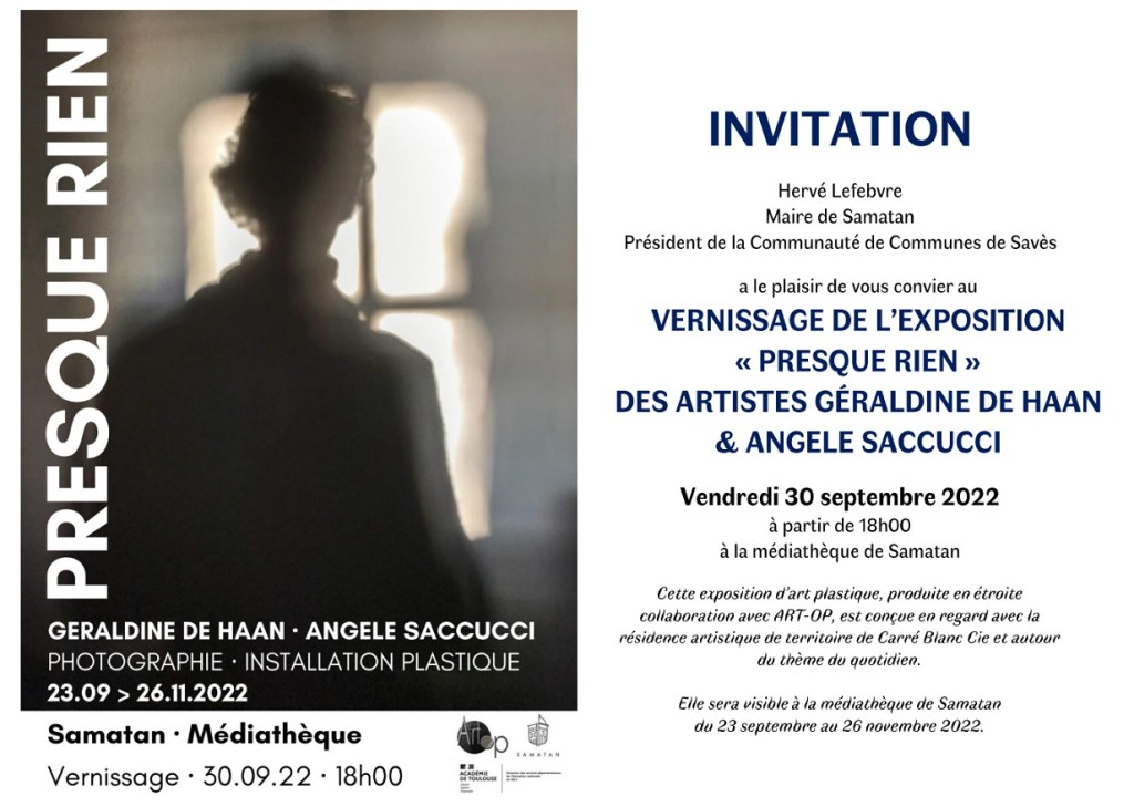 La médiathèque de Samatan expose les artistes Angèle Saccucci et Géraldine de Haan. Vernissage le 30 septembre. Voir les affiches, ci-dessous.