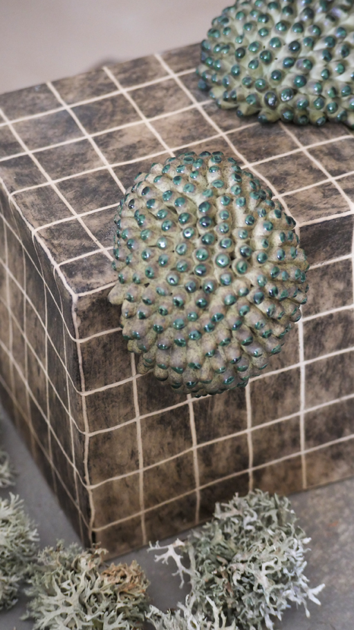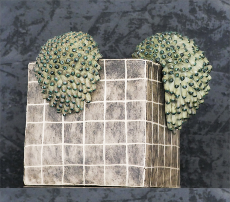 Cette pièce est particulière et différente du travail connu d’Éliane, proposant une symbiose entre ses séries sur la Maison et ses œuvres hésitant entre végétal et animal ; parasites ? Nature reprenant ses droits? La forme cubique gravée fait figure et accentue une posture défensive …