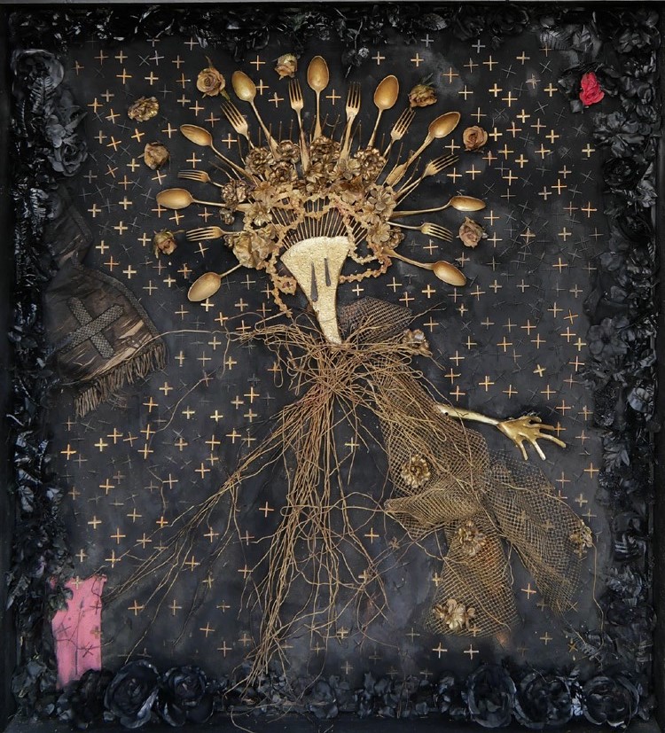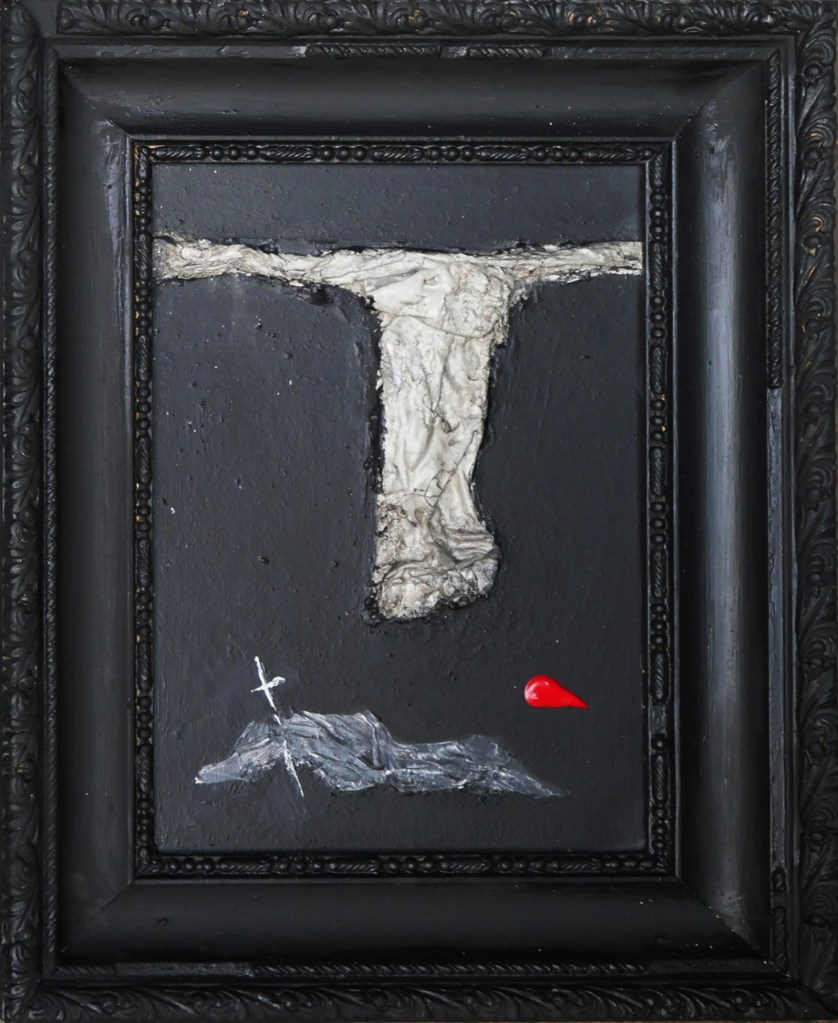 Tous les tableaux sont en technique mixte sur médium (bois), encadrés caisse américaine noire.