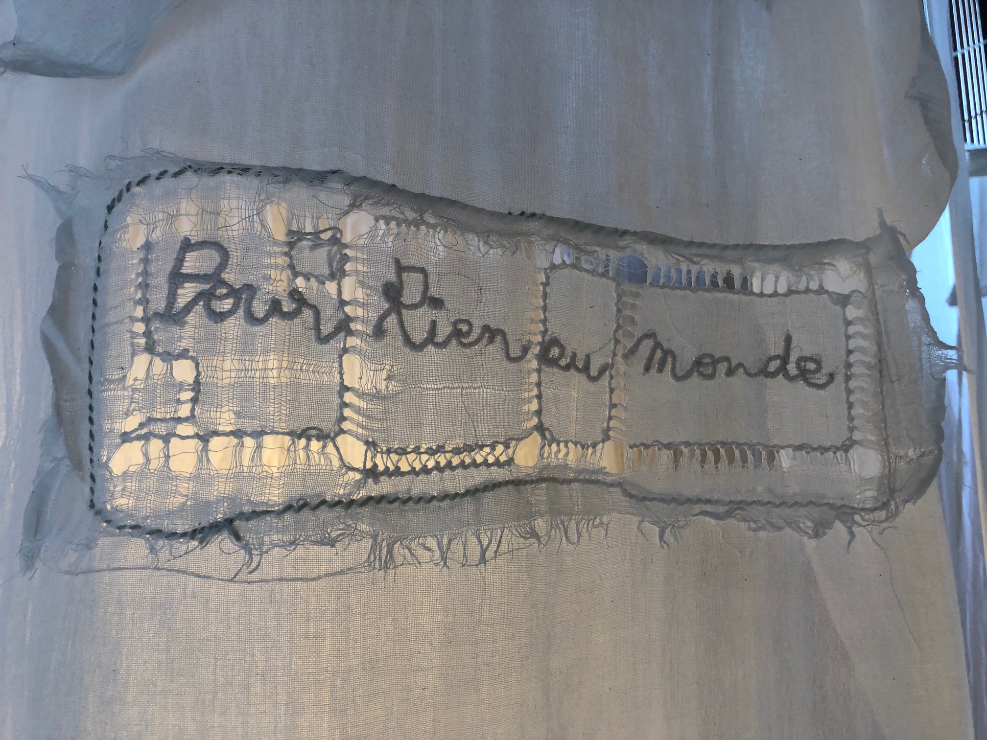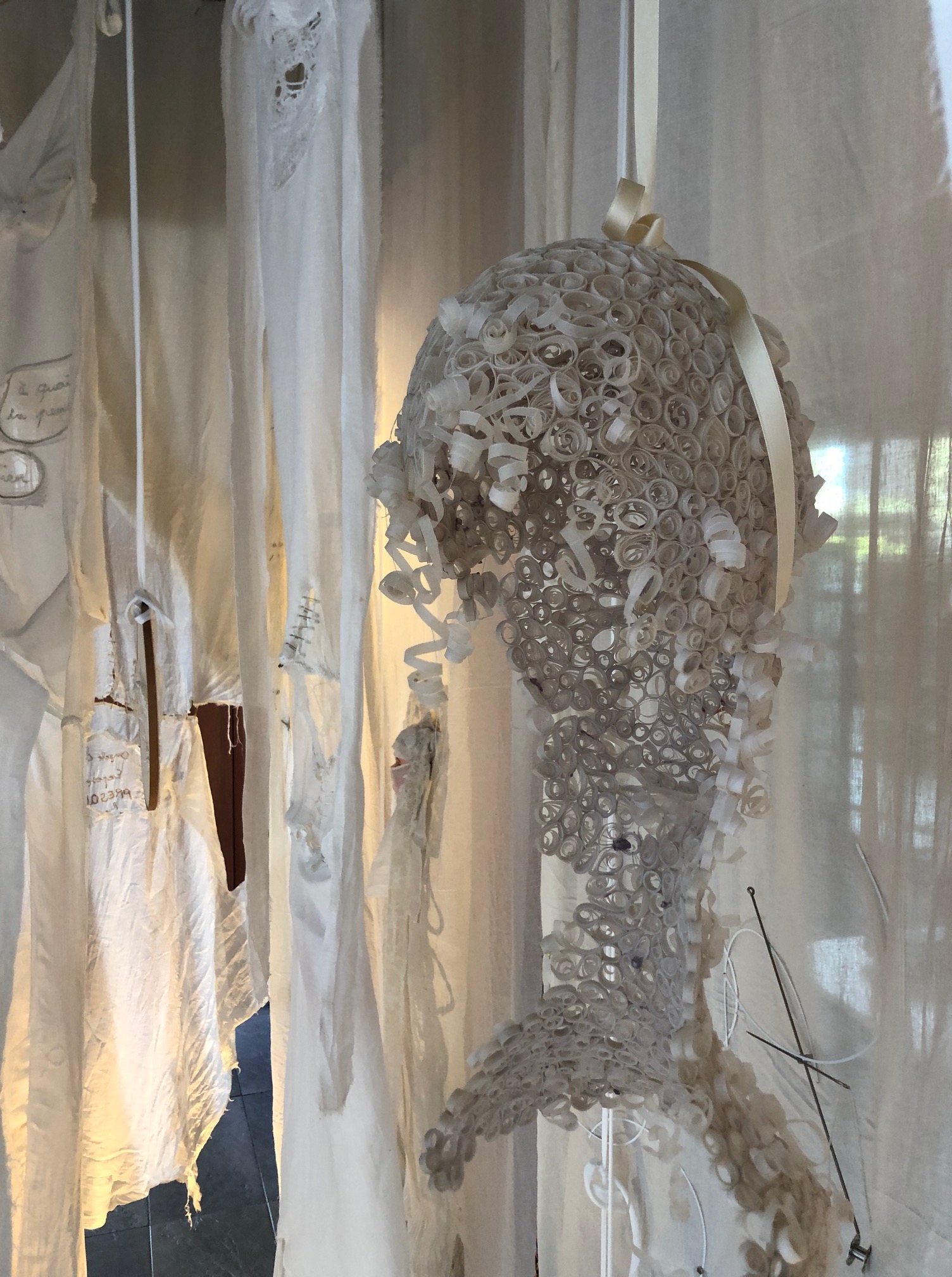 Cette installation est aussi un hommage à toutes ces femmes, mères, grands-mères qui accommodent ( raccommodent ) notre quotidien, avec des restes, des petits riens qui illuminent nos vie, et qui sont autant « de madeleines de Proust » dont nous nous souvenons avec tendresse.