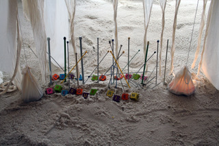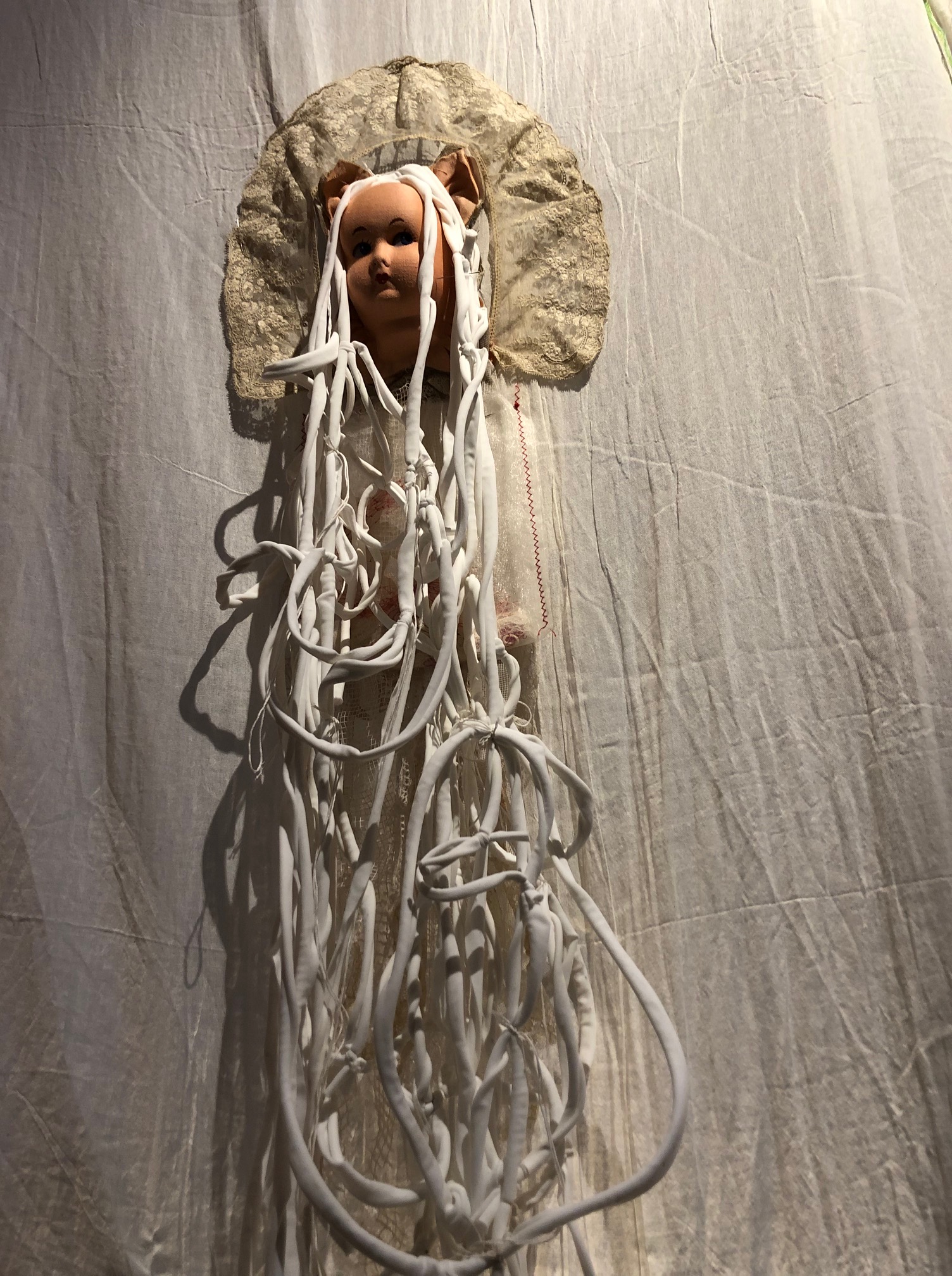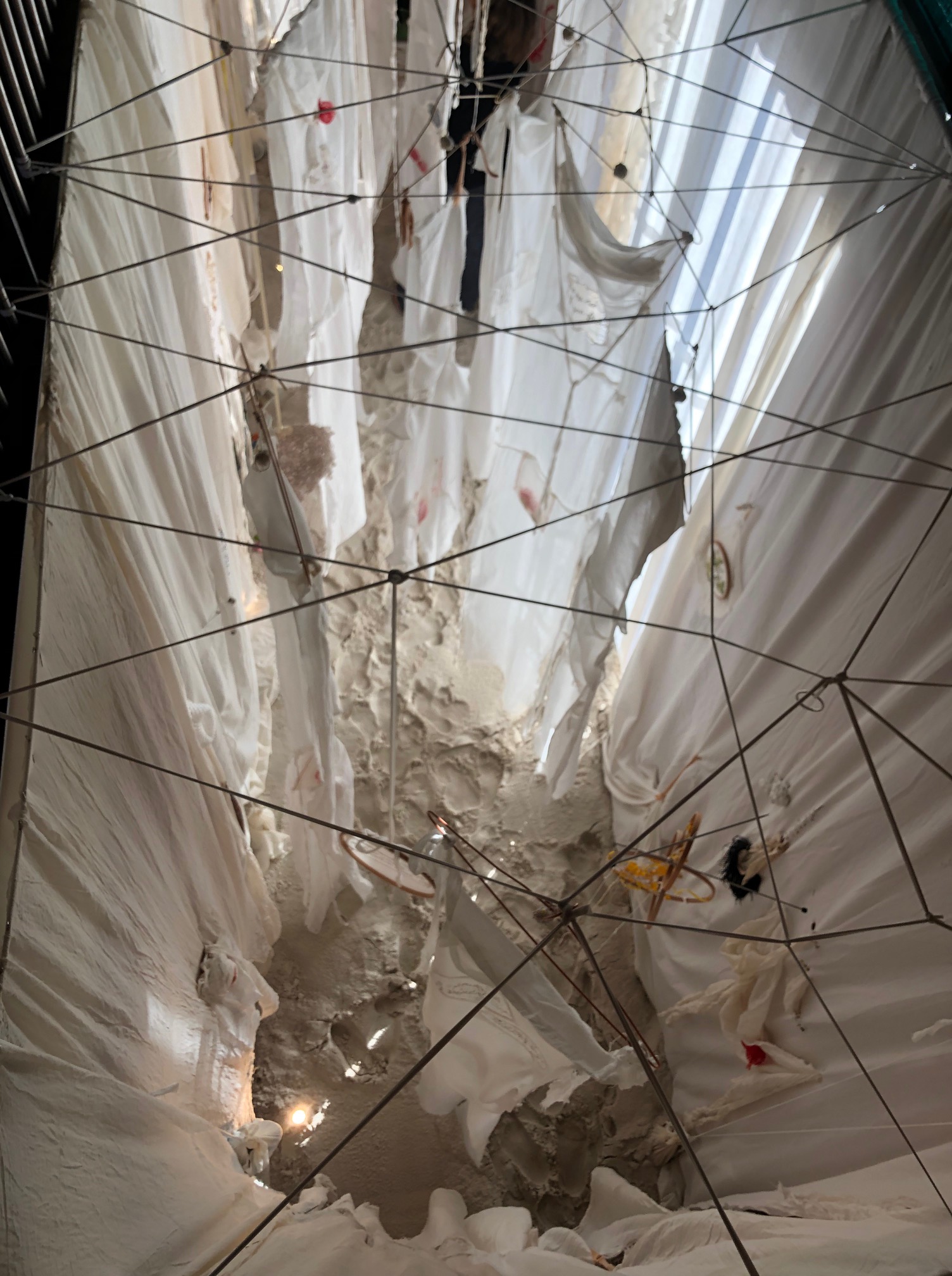 Cette pièce, créée en 2015, en évolution permanente, est avant tout une tentative d’ouvrir tous nos sens à la poésie du quotidien. Ici nuls matériaux « nobles » dédiés habituellement aux Beaux arts. Avec des « bouts de ficelle », construire un espace propice à la divagation de l’esprit où tous nos sens sont mis en éveil. On peut toucher, être touché par la remontée des souvenirs fantomatiques, invitant souvent l’enfance, cette période privilégiée de l’imaginaire, de la créativité exacerbée, du jeu.