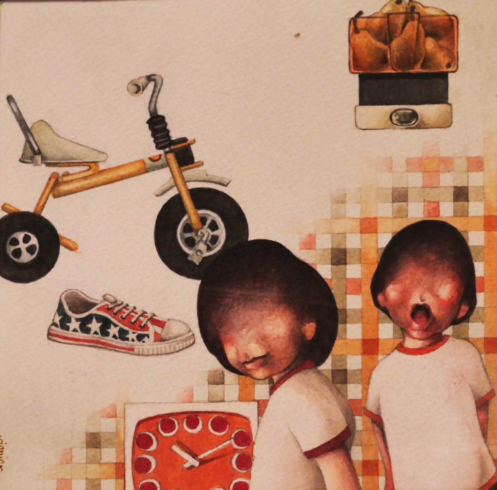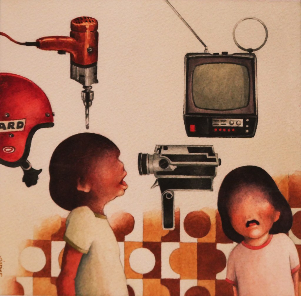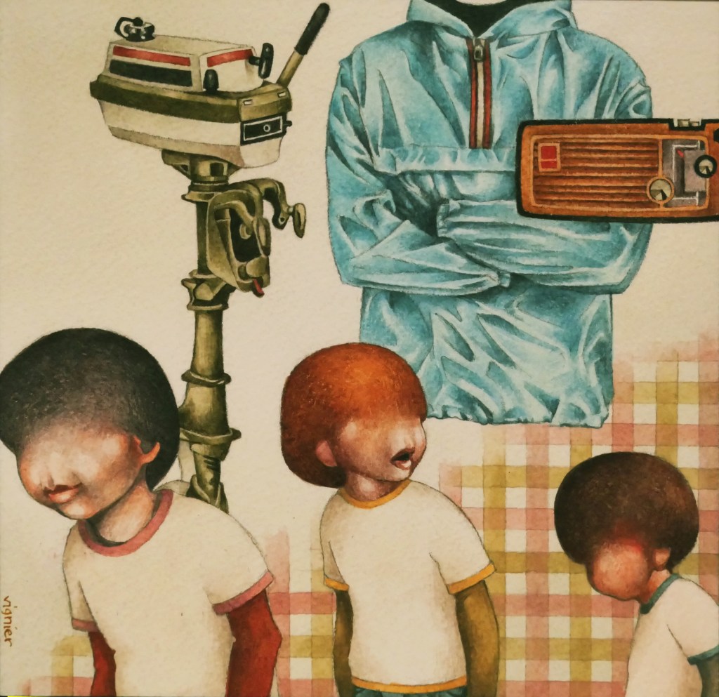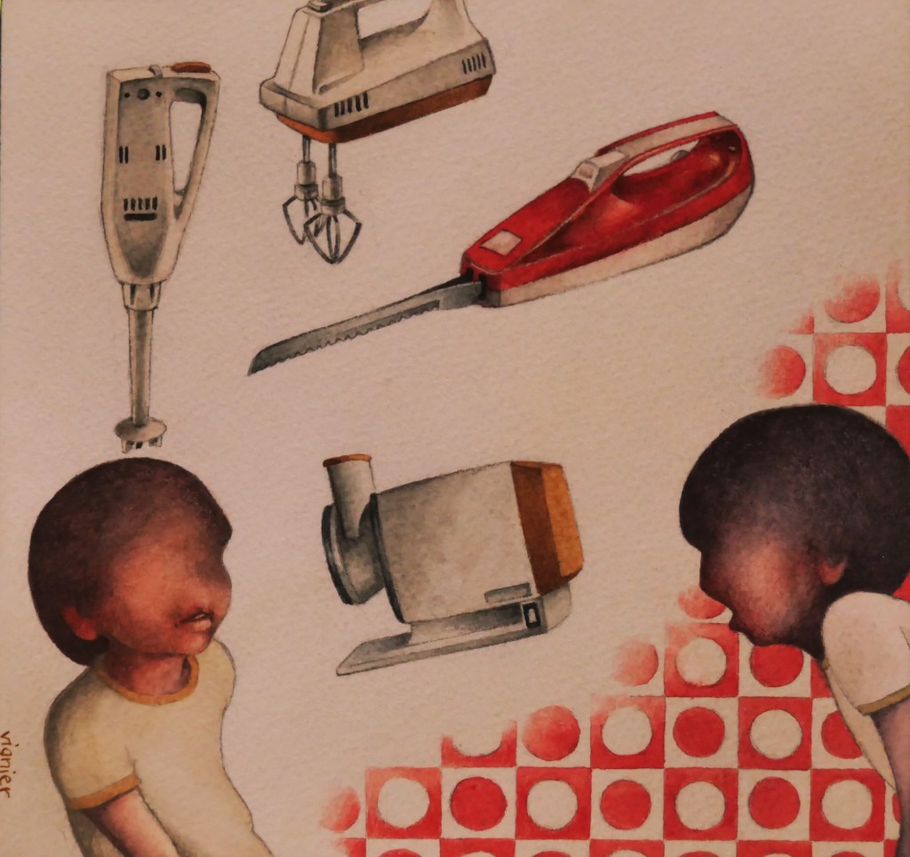 Mathieu VIGNIER a fait ses études d’Arts plastiques à l’Université Bordeaux-Montaigne. Installé dans l’Hérault, il fouille du côté de l’enfance, puise dans l’univers des objets qui, ici, ont leur place particulière alors que Mathieu a vécu la production et la diffusion à outrance de ces derniers, progrès envahissant des cuisines, des garages, des loisirs… prolongements de nos mains, de nos yeux, pieds, bouches… Les yeux disparaissent comme ceux des oisillons réduits à un bec vorace toujours prêts à dévorer et sans nulle autre pensée qu’ avaler ce qu’on leur donne, impose…