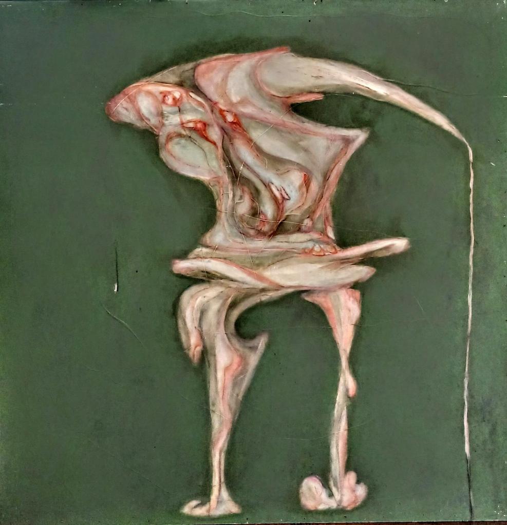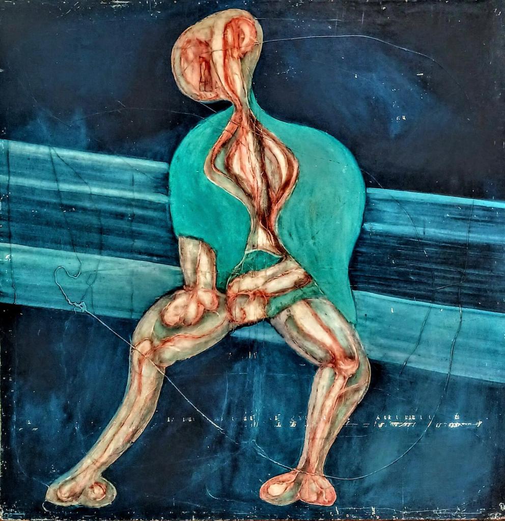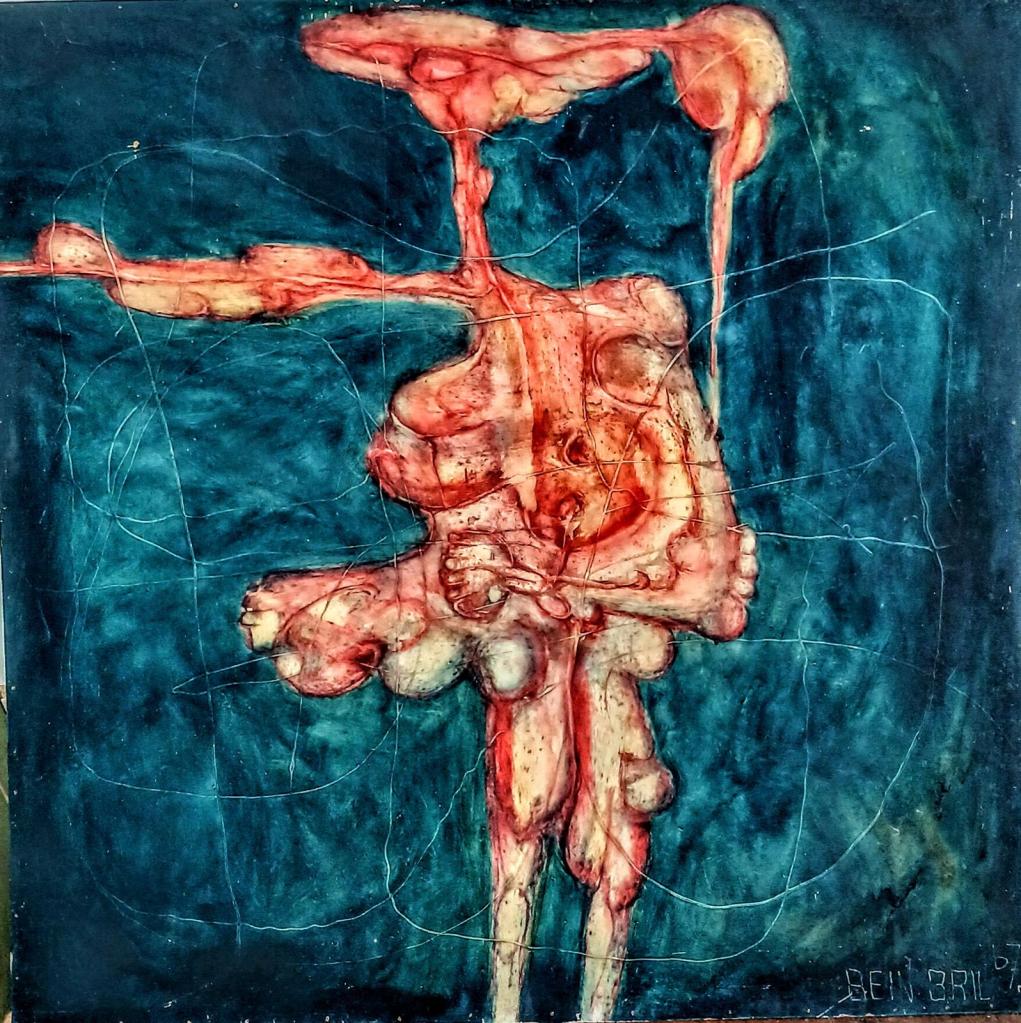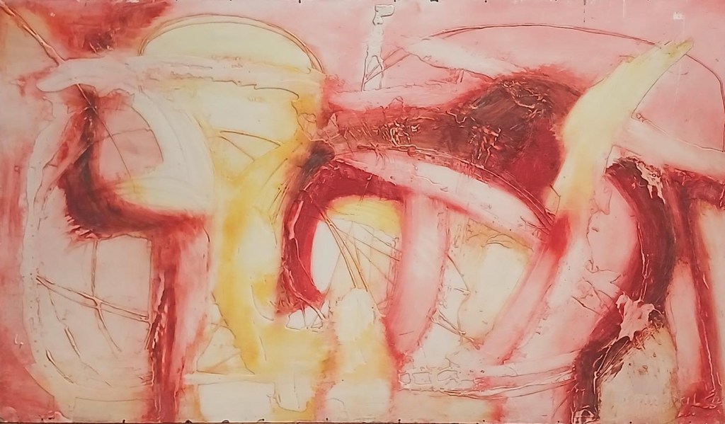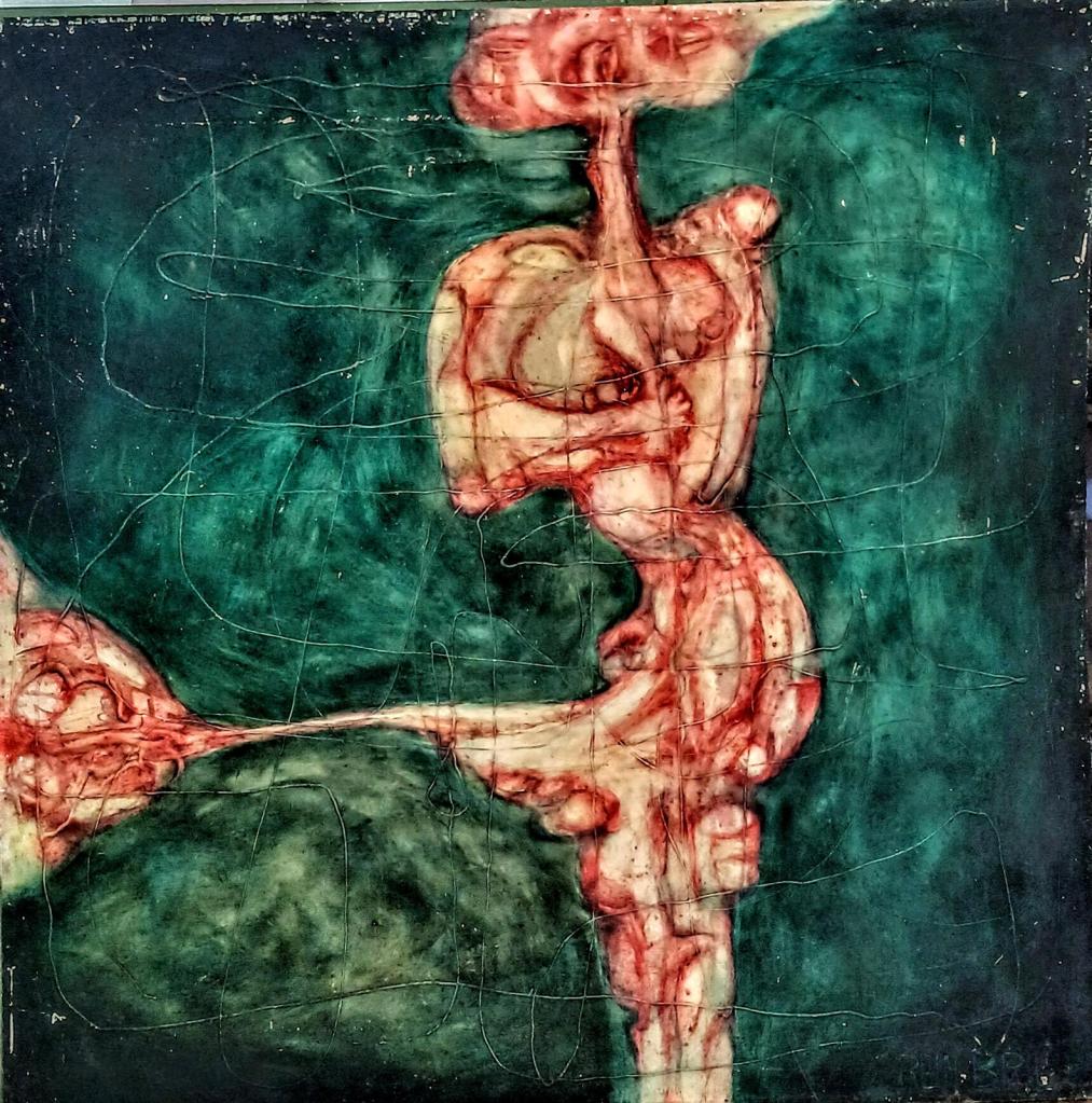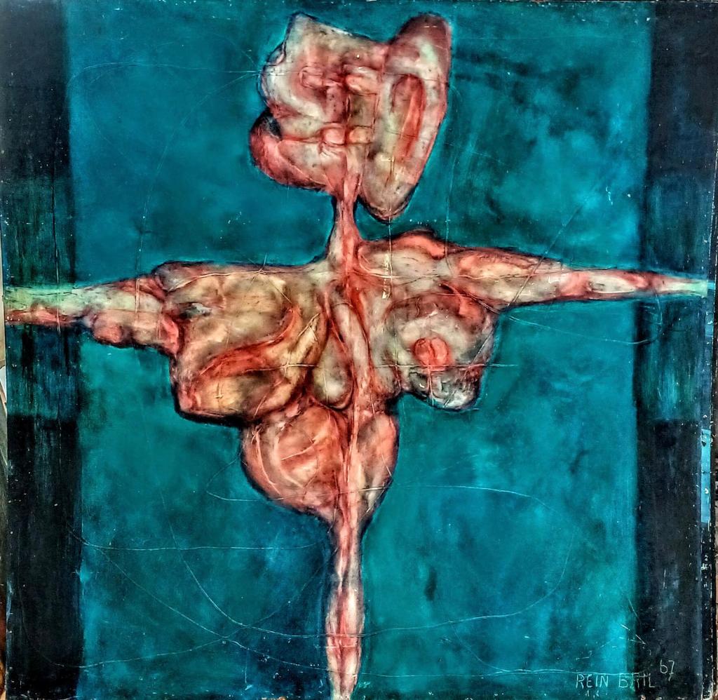Rein BRIL traite de la limite entre peinture abstraite et peinture figurative, renouvelant la problématique de la figure comme l’abordait Bram Van Velde.L’œil doit être averti et curieux de dénicher, dans l’entrelacs des graphismes, le corps dénudé, la mandorle ou triangle suggestifs, la couleur qui trahit la présence de la chair.